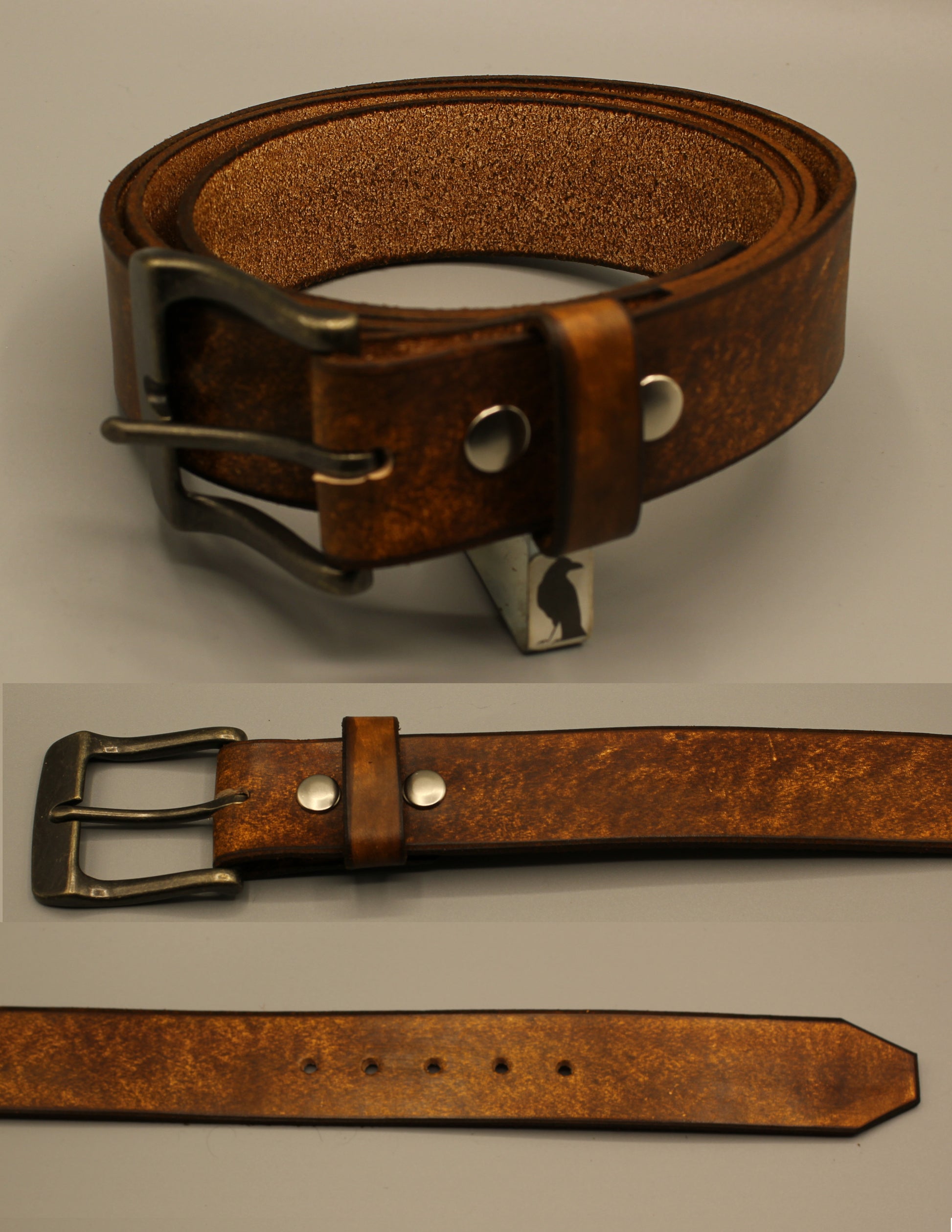 For a simple and neat rustic look, this Classic Plain belts are just ideal. These leather belts are made from thick 8/9oz vegetable tanned cowhide, (approx. 3/16" or 3.4mm). We strap them to width, emboss, stain and cut to length all here in my humble shop. For hardware, I use reliable Line 20 snaps to fasten the buckle. This makes for a sturdy hold yet lets you replace or exchange the buckle easily.